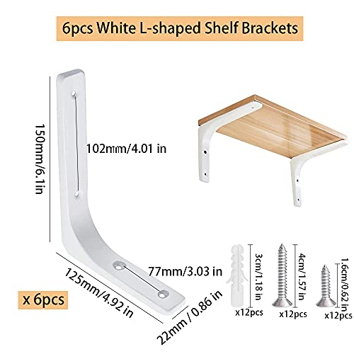 Staffe per Mensole Pesanti Bianche 6pcs Staffe Mensola Muro Staffa a L per Mensole Supporti per Mensole per Tavolo da Lavoro Salvaspazio Fai-Da-Te Carico Massimo 30 Kg 150 * 125mm