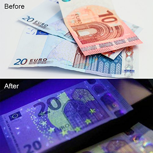 Torcia UV led: con i raggi ultravioletti, questa torcia può rilevare facilmente le macchie di urina secca di animali domestici su tappeti, tende o tende; Adatto invece anche per rilevare banconote, patenti, carte d’identità o passaporti.