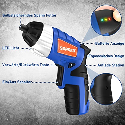 SORAKO Avvitatore Elettrico 6Nm Cacciavite Elettrico 3.6V con 30 Accessori, Cacciavite con Luce LED, 2 Direzioni di Rotazione, Indicatore Batteria e Caricabatterie, Professionale per Fai da Te