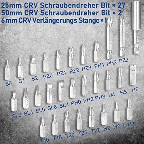 【Accessori abbondanti e interruttore avanti e indietro】 L’avvitatore elettrico viene fornito con 30 accessori, tra cui una varietà di punte da trapano (25 mm e 50 mm) e un’asta di prolunga (60 mm), sono adatti per quasi tutti i tipi di viti, adatti per il montaggio di mobili , riparazione giocattoli e riparazione apparecchiature elettriche. L’avvitatore a batteria con interruttore positivo e negativo è facile per l’installazione e la rimozione delle viti, molto adatto per il montaggio di mobili