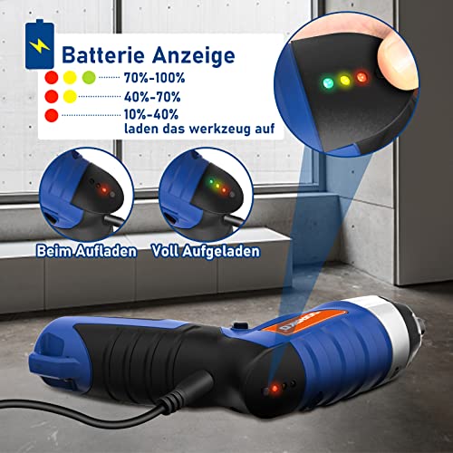 【LED e funzione conveniente】 – Cacciavite elettrico dotato di LED di evidenziazione sicuro, adatto per ambienti bui o angoli bui, le luci a LED possono aiutare in piccoli lavori di manutenzione. Quando viene premuto il piccolo pulsante nero, diversi colori possono indicare l’utilizzo della batteria dell’avvitatore a batteria, comodo per caricare il cacciavite in tempo
